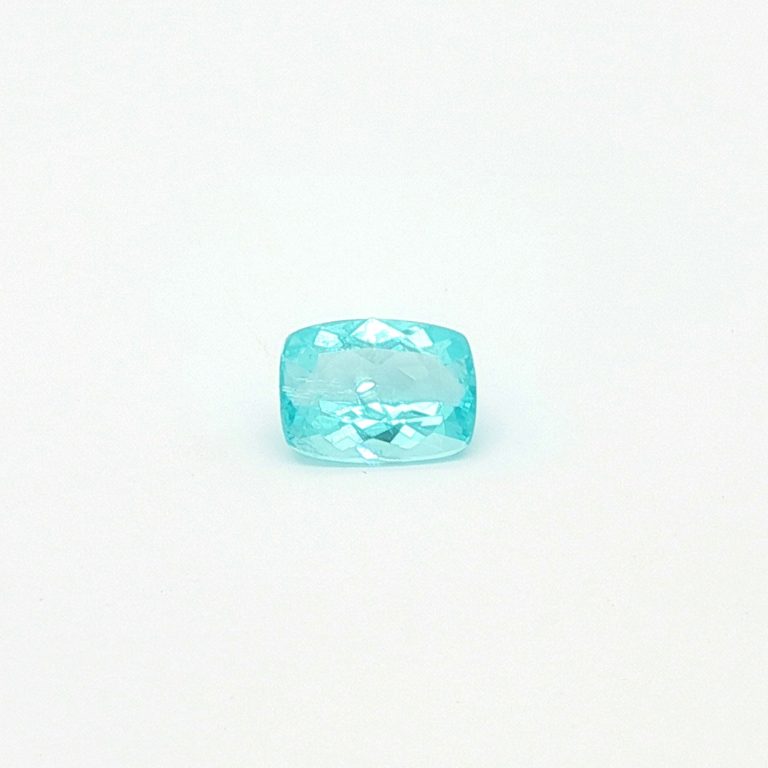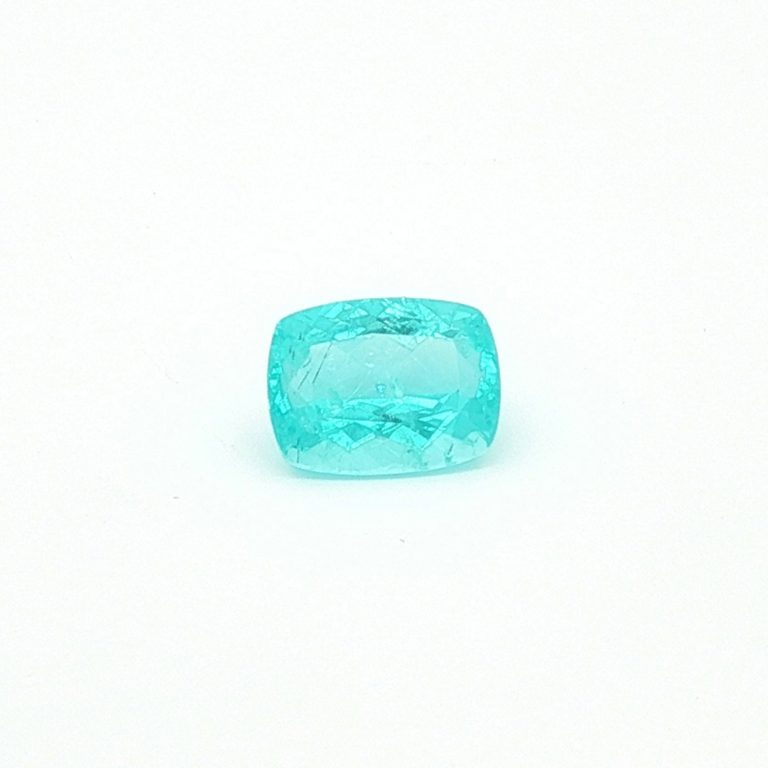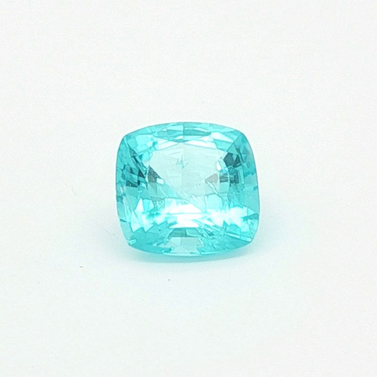 A glowing cushion-cut Paraiba with vivid greenish-blue color and soft, balanced proportions. A premium gem for custom designs.